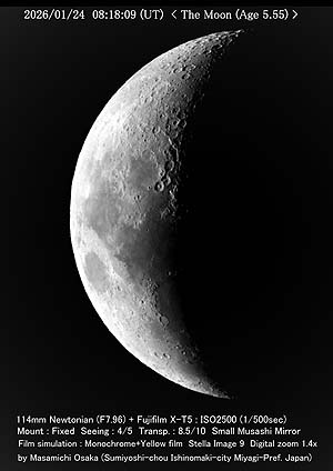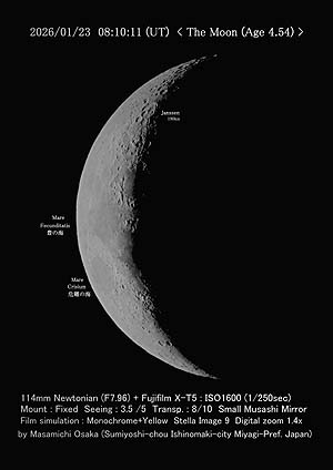こんばんは。本日は撮影無しです。昼間は天候が悪く、黒点は狙えませんでした。 太陽が出ても風速が10m/sくらいで望遠鏡の設置は出来ない状態でした。また、僕の左膝に痛みがあって、曲げられない状態だったので、無理をせずに休むことにしました。 気温は今-1℃となって風は7m/sなので寒いです。また、天気予報の雲の色が濃いので、雪がちらつく可能性があります。 今週末は、天候が良くありませんので、来週の月曜日までダメかもです。晴れて撮れるようなら撮ります。ただ、月の出が遅くなってくるので月は難しい時があると思います。 以上、今日の状況でした。体調を管理しながら、毎日を過ごしましょう。では、また。 |