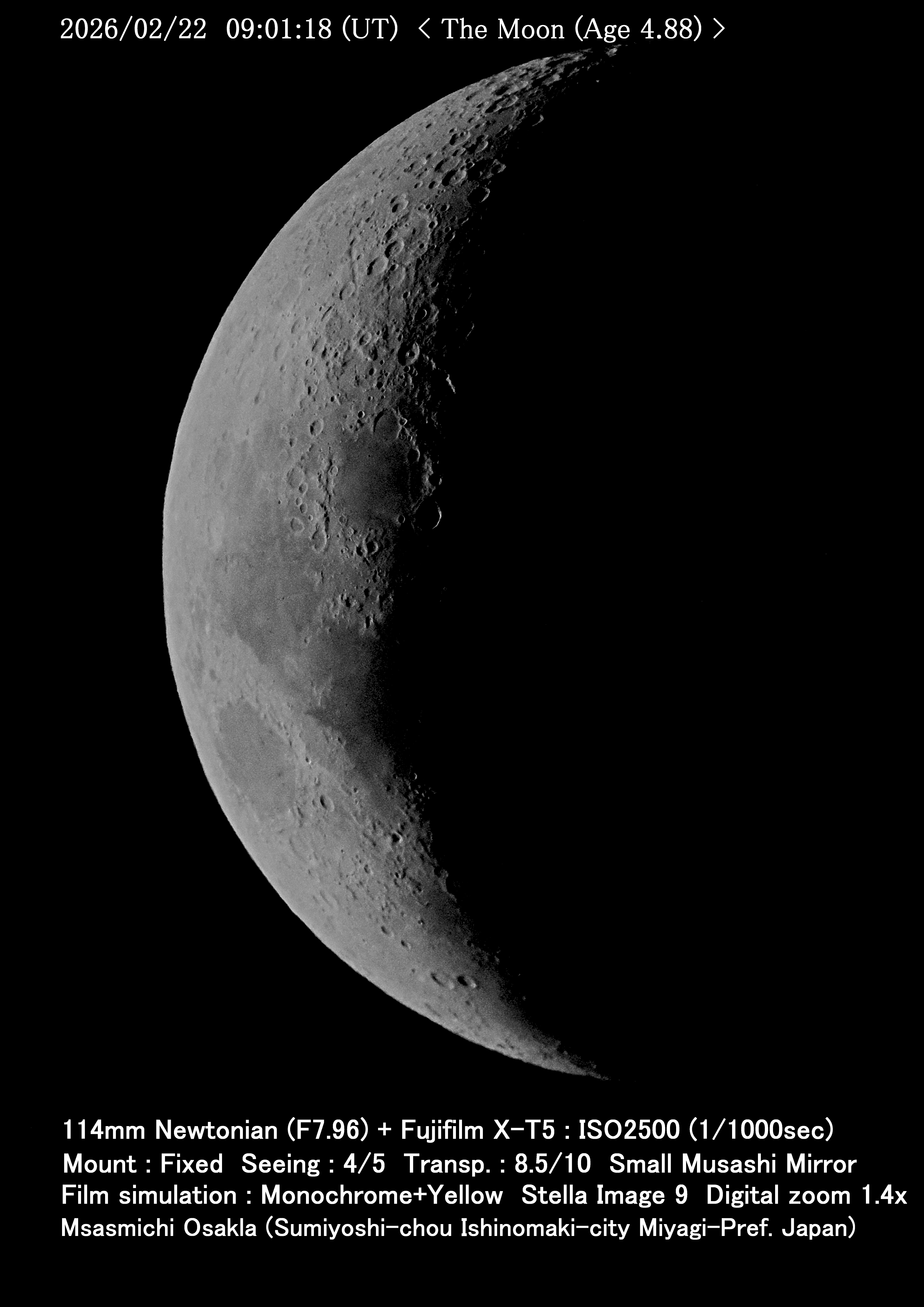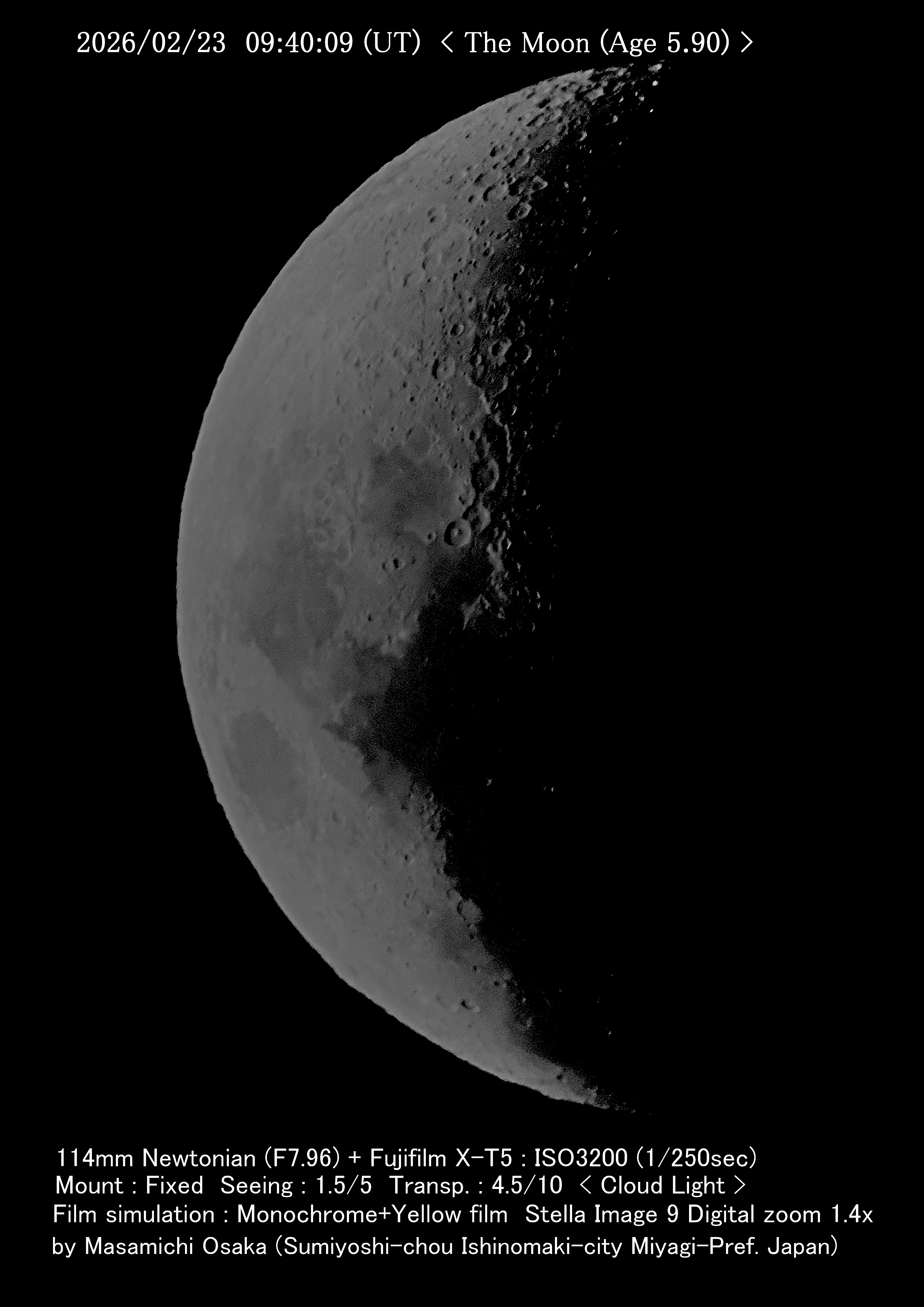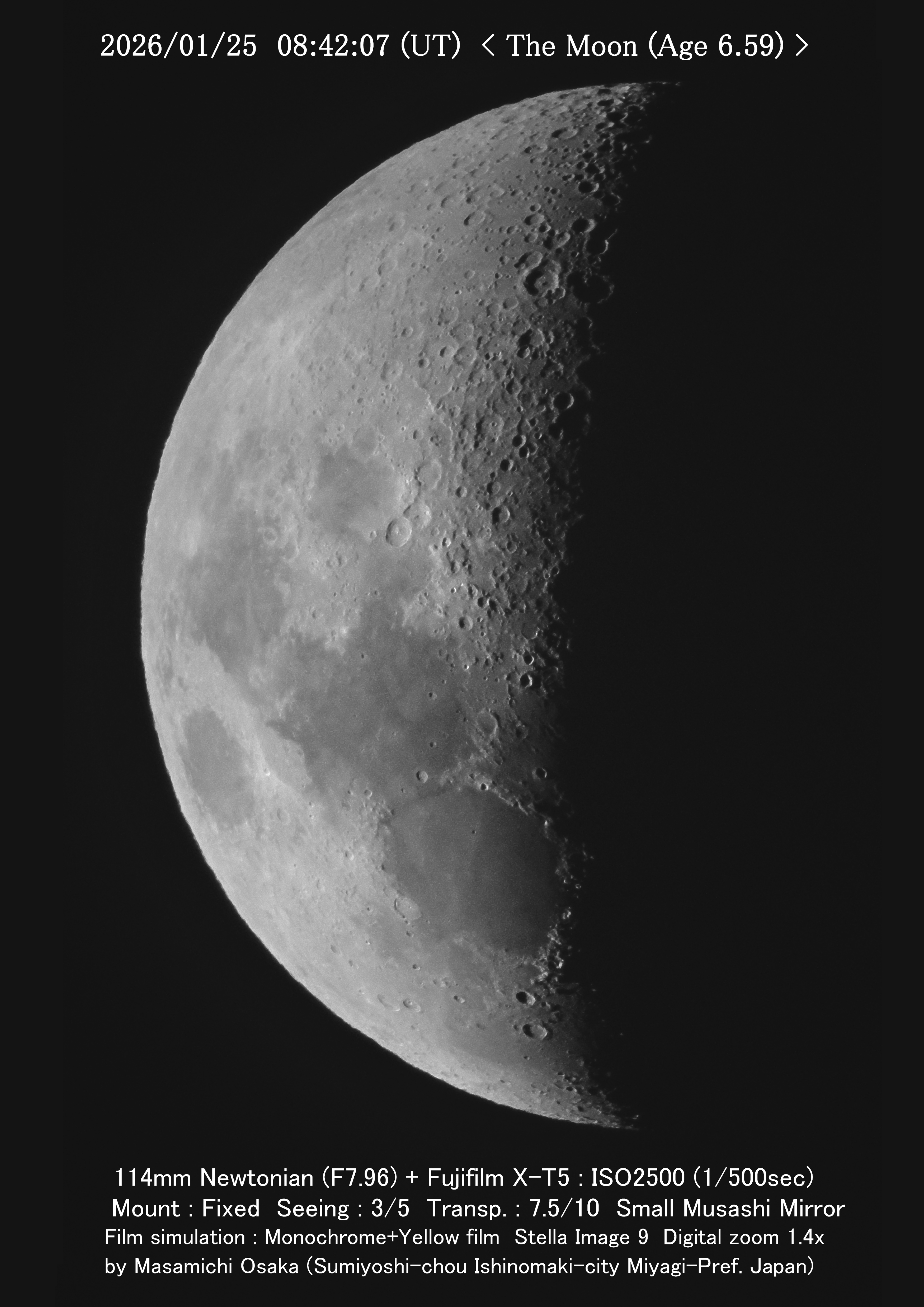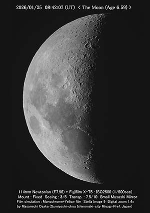 こんばんは。一応、撮れました。高度25°くらいなので、シーイングがあまり良くありませんでした。撮れただけ良しとします。 明日はお天気次第で決まります。黒点が撮れるタイミングがあるかどうかで、月は天気予報通りになれば撮れるでしょう。 |